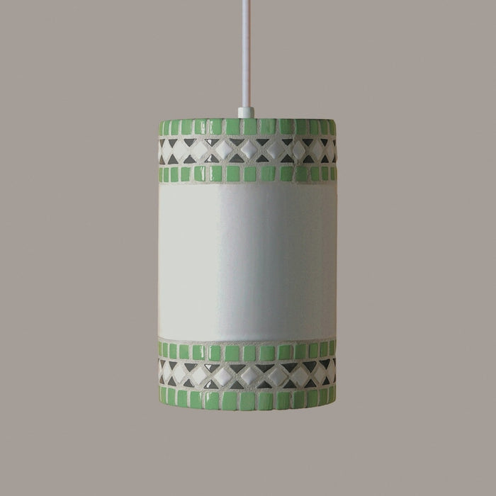 Classic, simple, timeless. The Borders Pendant is reminiscent of the mosaics of ancient Greece and Rome. Straight bands of Mint Green color at the top and bottom set off the squared diamond shapes. This one-of-a-kind pendant is made from kiln-fired glazed ceramic. The opaque ceramic shade blocks glare while providing generous energy efficient down-lighting.