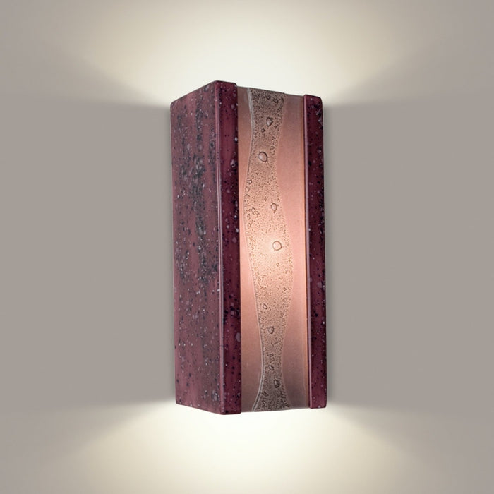 Colorful, fun and effervescent, this Plum Jam ceramic wall sconce frames a stream of bubbles trapped between layers of Amethyst glass. Light shines from the open top and bottom of the small and compact rectangular base and adds to the illusion of a cascading stream of light overflowing with bubbles.This one-of-a-kind wall light integrates fused art glass made from reclaimed window glass and kiln-fired glazed ceramic. Subtle color and texture variations are the hallmark of a truly handcrafted piece of art.