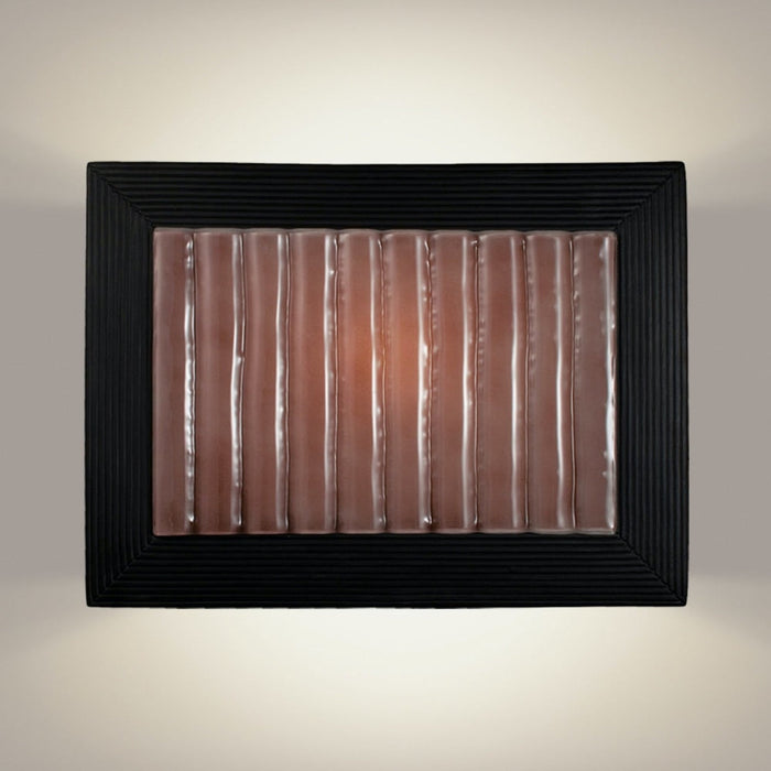 This one-of-a-kind wall light integrates fused art glass made from reclaimed window glass and kiln-fired glaze ceramic. Light shines from the top and bottom of the fixture as well as through the translucent rippled front glass pane. The Matte Black rectangular ceramic frame curve in gently at the back and has a Rosewood ribbed textured front, emphasized by the unique properties of the glazed finish. Subtle color and texture variations are the hallmark of a truly handcrafted piece of art.