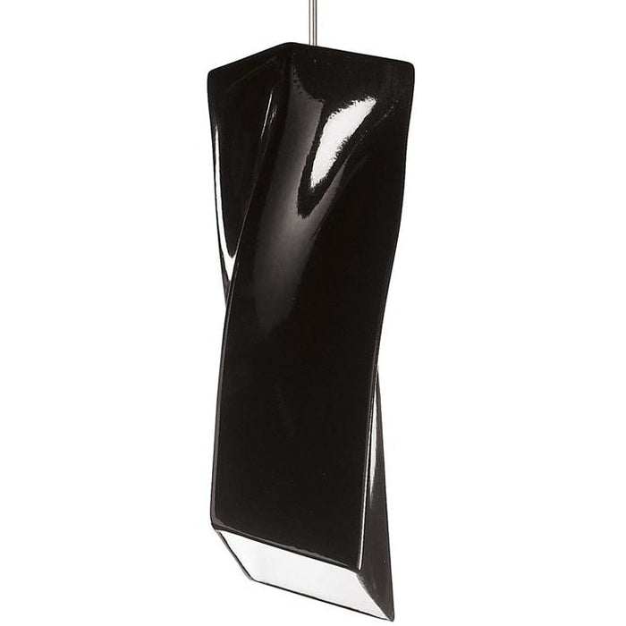 This one-of-a-kind pendant is contemporary featuring a twisting rectangle ending in an angle-cut bottom. Black Gloss glaze keeps the Twister Low Voltage Mini Pendant sophisticated. The opaque ceramic shade blocks glare while providing generous energy efficient down-lighting.