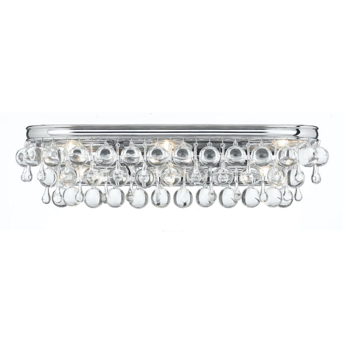 The sparkle of blown glass, paired with the gleam of polished chrome, give this vanity light a modern elegance. Sleek and contemporary, the Calypso Collection is decorated with cascading crystal clear smooth glass balls and teardrops that really reflect the light. The collection's design was based on a custom chandelier created for a hip, retro restaurant, and it'ss perfect for any space that needs a little extra sparkle and glamour. These versatile fixtures are stunning in a dining room or entryway, hung over a kitchen island, lighting a hallway or providing sparkle in a closet or even a little girl's bedroom.