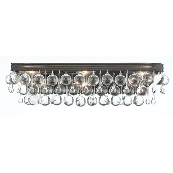 The sparkle of blown glass, paired with the gleam of vibrant bronze, give this vanity light a modern elegance. Sleek and contemporary, the Calypso Collection is decorated with cascading crystal clear smooth glass balls and teardrops that really reflect the light. The collection's design was based on a custom chandelier created for a hip, retro restaurant, and it'ss perfect for any space that needs a little extra sparkle and glamour. These versatile fixtures are stunning in a dining room or entryway, hung over a kitchen island, lighting a hallway or providing sparkle in a closet or even a little girl's bedroom.