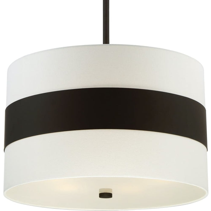 Libby Langdon has given the classic chandelier a modern update with a ribbon of Dark Bronze that lends the Grayson Collection a fashionable mid-century appeal. Versatile enough to fit into any interior, this fixture produces a soft diffused light that adds warmth to any space. This chandelier features a fixed stem and flat ceiling cap with a cream textured silk shade. A great look for any decor, this chandelier looks great in multiples over a table or even in a grand living room, though this fixture look great no matter what room it adorns.