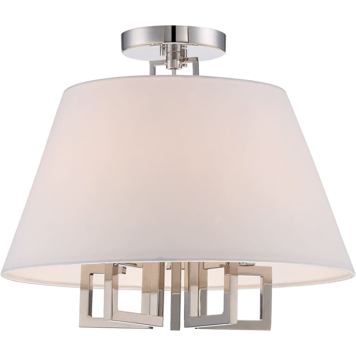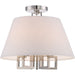 The signature Libby Langdon attention to detail is apparent in the Westwood collection. This ceiling mount features an angular polished nickel frame topped with crisp white shades for an eclectic yet modern design. "I truly believe design is in the details. An element I love with the Westwood collection is how the top loop mimics the same angles as the lower metal fretwork. It's a small attention to detail but a big part of the overall look because it artfully repeats the design theme and helps to balance the fixture," Libby Langdon Perfect for a dining area, living room or even entry way, this fabulous fixture will add the perfect accent to any space.