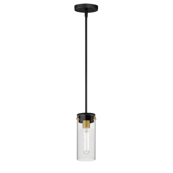 Simple clear glass cylinders are secured by decorative thumb screws in this transitional collection of sconces and pendants both neutral in design and suitable for damp applications. Choose from Satin Nickel or a two-tone Black and Satin Brass finish to pair with popular interior finishes in hardware, plumbing and decor.