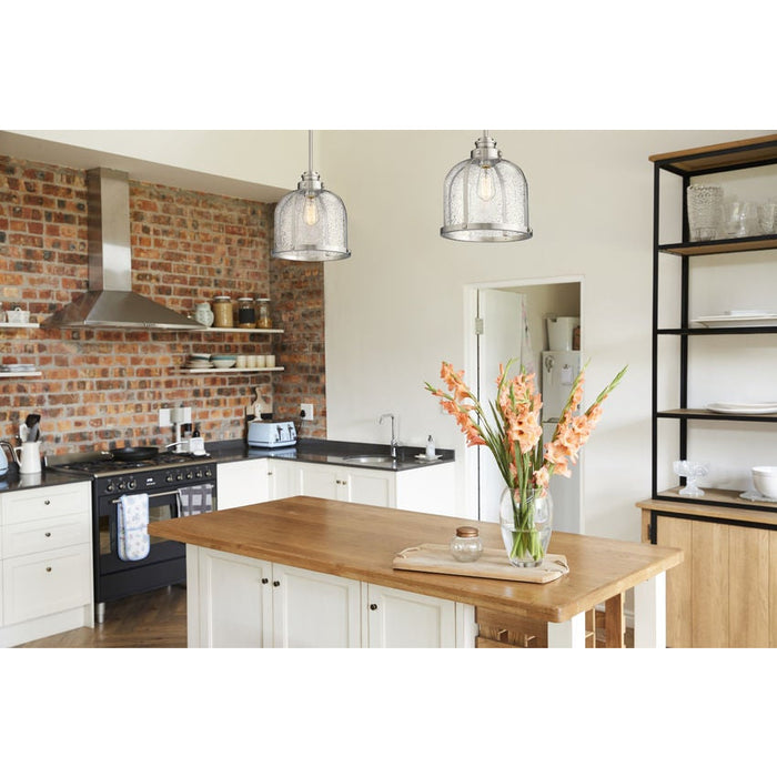 Add character to a dining or living space with this brushed nickel finish one-light pendant. Seedy glass creates an ethereal domed shade that nestles in an industrial-inspired steel frame, offering an eye-catching design element.