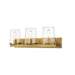Showcasing a rich, rubbed brass finish, this metal vanity light makes a stylish impression in a modern powder room. Three tapered, clear glass shades complete the design in effortlessly elegant style.