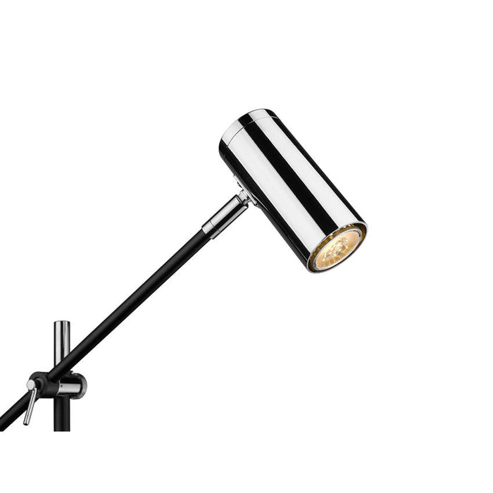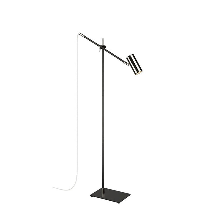 This contemporary floor lamp with a cylindrical shade will brighten up your home office or living room. Serving as the ultimate task light, this fixture is constructed of steel in a matte black finish and polished nickel accents for a sleek and simplistic appeal.