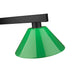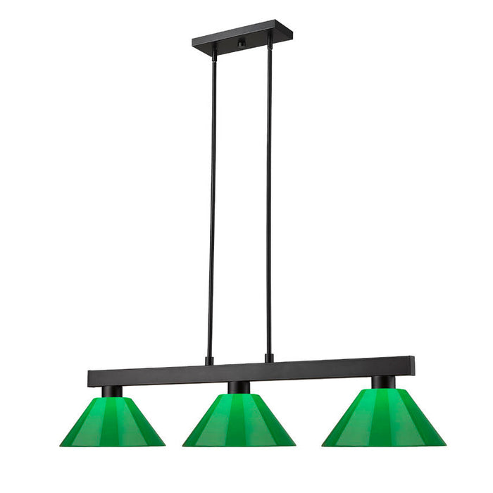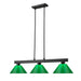 Straight line inspired detailing defines this beautiful three light fixture. Finished in Matte Black and paired with Green Shades, this three light fixture would be equally at home in the game room, or anywhere else in the house needing a touch of modern charm. Adjustable rods are included to ensure the perfect hanging height.