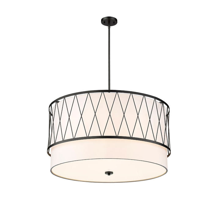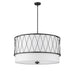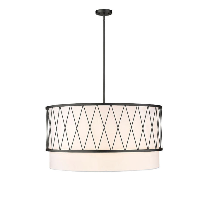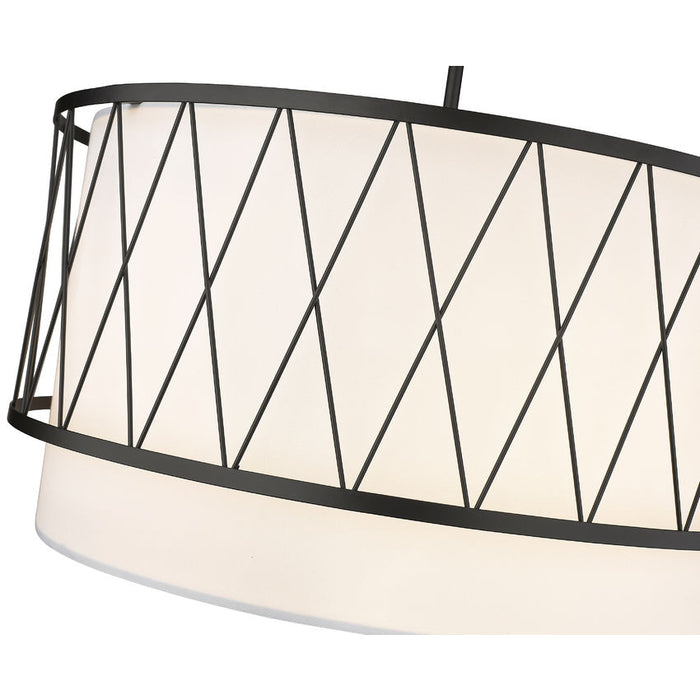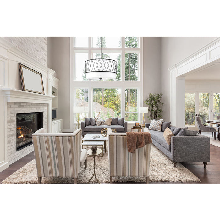 The Dalton pendant offers a universally flattering diamond pattern that dovetails nicely with many styles in the home. The strong steel outer cage makes a dynamic statement in both large and small rooms, while the inner linen fabric shade gently softens the look. Three sizes are available, along with a choice of two highly versatile finishes: Brushed Nickel for more nuanced appeal and Matte Black for a bolder approach.