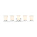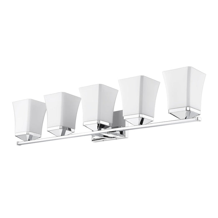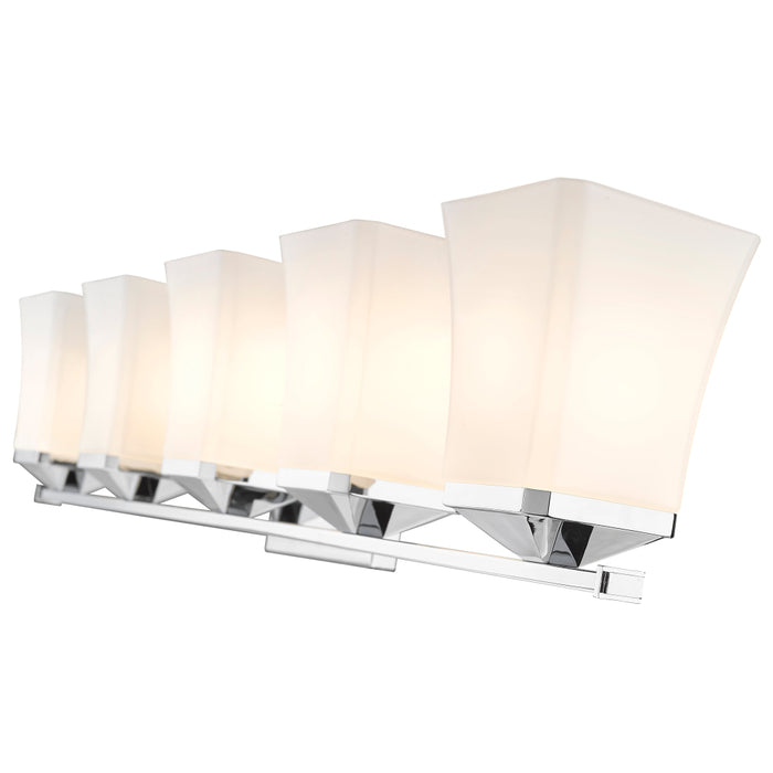 This simple yet stylish five-light vanity fixture is an easy upgrade to your bathroom. Featuring five glass shades in etched opal, a flared silhouette instantly catches the eye along with a chrome finish.