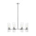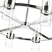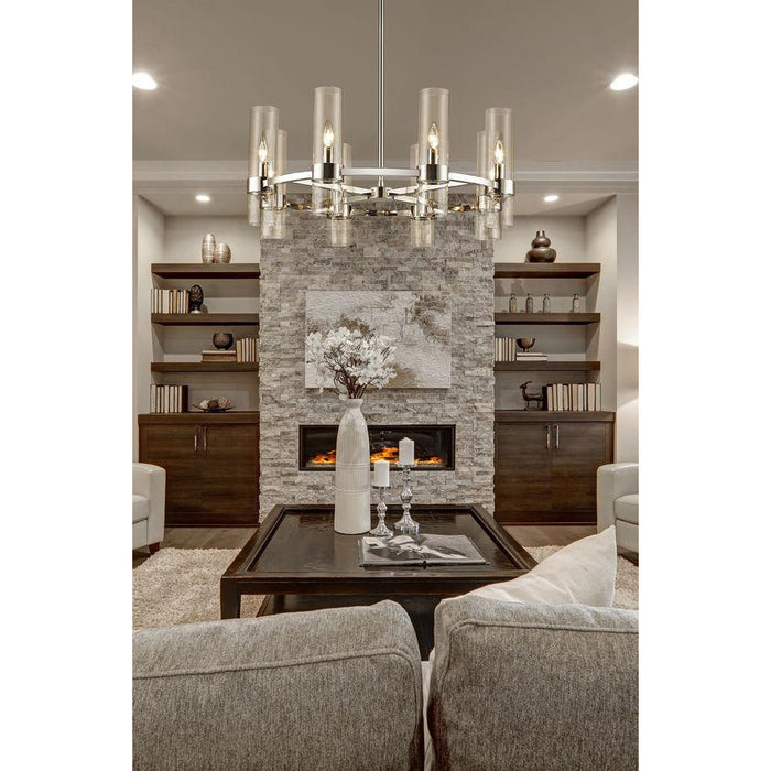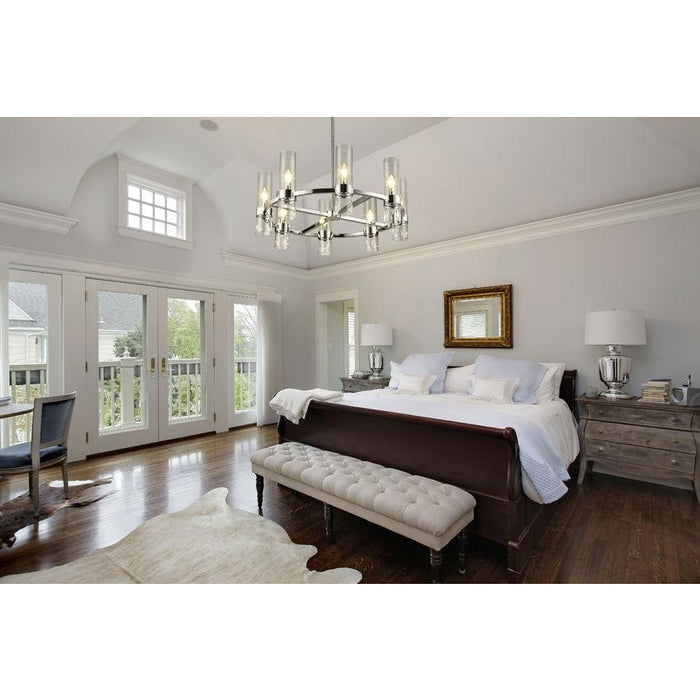 Distinctive modern style takes a page from industrial-inspired flavor, creating a captivating fixture blending polished nickel finish steel and glass. With a circular spoke-style frame, the Datus eight-light chandelier lends a minimalist approach to lighting with enough glam to stand out. Perfect for a small- to mid-sized contemporary dining room, kitchen, or hallway, this chandelier delivers elegance with a round frame crafted of polished nickel finish iron, dressed up with delicate clear glass cylinder shades.