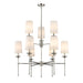 Gleaming polished nickel adds a standout finish to a classic fixture, making the Emily nine-light chandelier an exceptional option for transitional spaces. Capture attention with a fixture featuring stemmed lamp-like lights topped with off-white fabric shades, and mounted to an intricate frame made of polished nickel finish steel. A tapered silhouette turns this chandelier into a compelling choice for highlighting dining spaces, entryways, and main living areas.
