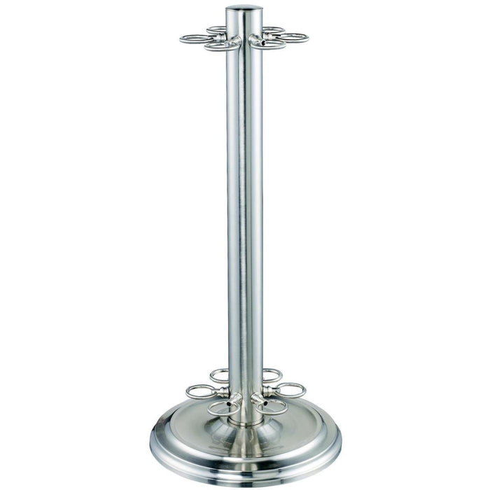 This cue stand is finished in brushed nickel and would be at home in any game room.