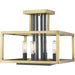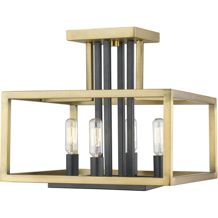 Modern geometric styling receives a softening effect from a warm olde brass finish, making this steel four-light semi-flush-mount ceiling light an exceptional choice. Fold metropolitan appeal into a design scheme that works with high and low ceilings, and enjoy the eye-catching blend of brass and bronze.