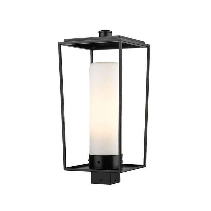 Top an existing post with the Sheridan one-light outdoor post mount fixture and revive the classic look of chic exterior lighting. This fixture features an open boxy lantern-style frame reminiscent of village fare. Made of black finish steel, it shelters a sleek white opal glass shade.