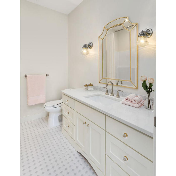 Low-key and tasteful, this one-light wall sconce from the Vaughn collection lifts the mood in a casual space with a charming village-inspired theme. Blending nautical with industrial, this sconce features a clear seedy glass shade in a unique schoolhouse shape, nestled to a cool brushed nickel finish steel frame with a dimensional round wall mount and holder and an extra accent piece.