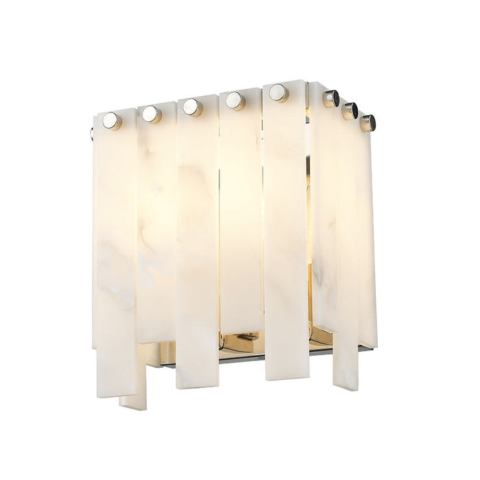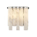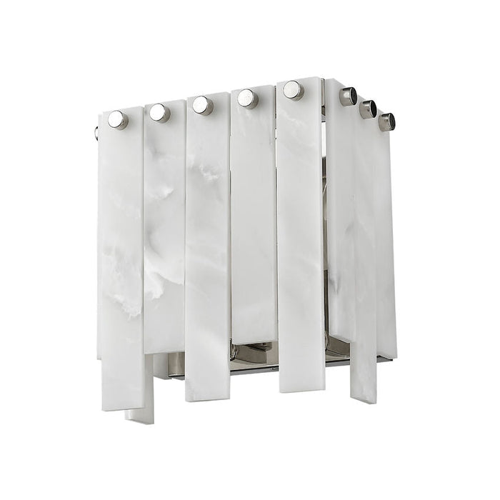 An intriguing Art Deco aesthetic leans toward minimalism in the design of a fixture that sets itself apart. This two-light wall sconce from the Viviana collection offers a decadent design featuring tasteful alabaster-like strips alternating in length and arranged around a squared polished nickel finish steel frame. Dressed up with whimsical rivot detailing, this sconce goes with the flow as it complements a gritty rendition of toned-down glam in a main living setting, en suite, or bedroom.