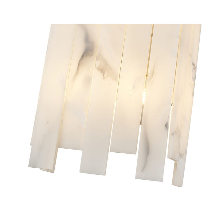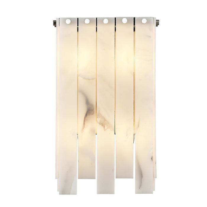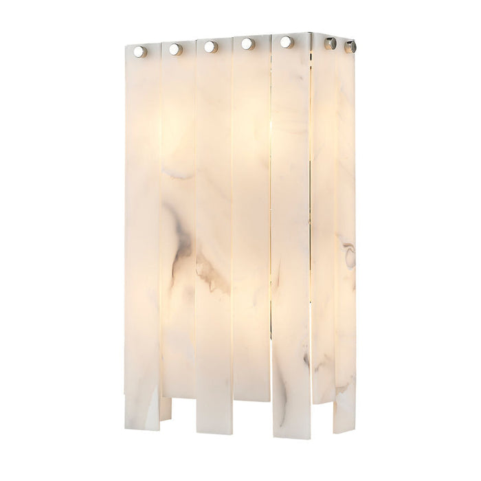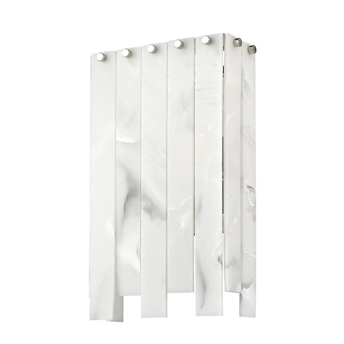 Strive for eye-catching artistry in the mode of Art Deco as you outfit a custom space with ambient and accent lighting. This four-light wall sconce from the Viviana collection creates impact with alabaster-like strips alternating in length and arranged around a rectangular polished nickel finish steel frame. Dressed up with whimsical rivot detailing, this sconce goes with the flow as it complements a gritty rendition of toned-down glam in a main living setting, en suite, or bedroom.